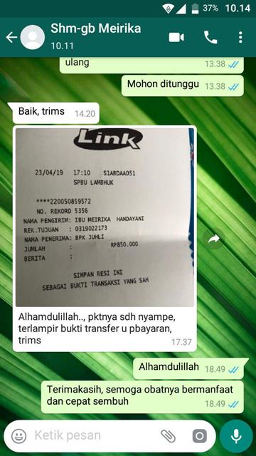 - Obat dikirim dulu dan dibayar setelah diterima. Pembayaran lewat transfer ke rekening yang kami sertakan dalam paket obatnya. Segera konfirmasi setelah transfer pembayaran