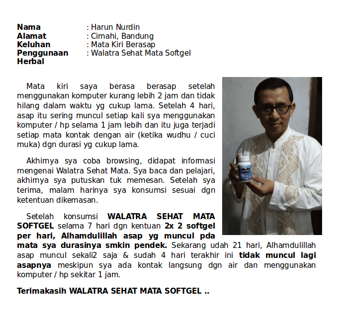 Limatta Softgel telah banyak mendapat testimoni positif dari konsumen dan telah membantu banyak orang untuk pulih dari gangguan penglihatan.